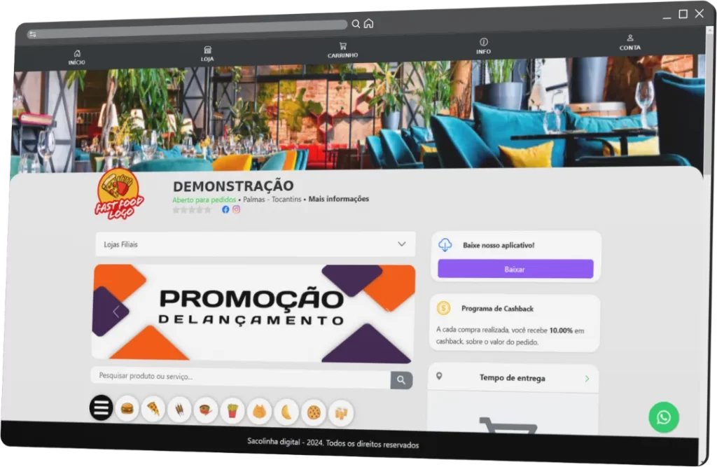 Personalize com suas cores, imagens e redes sociais, organize suas categorias e cadastre seus produtos